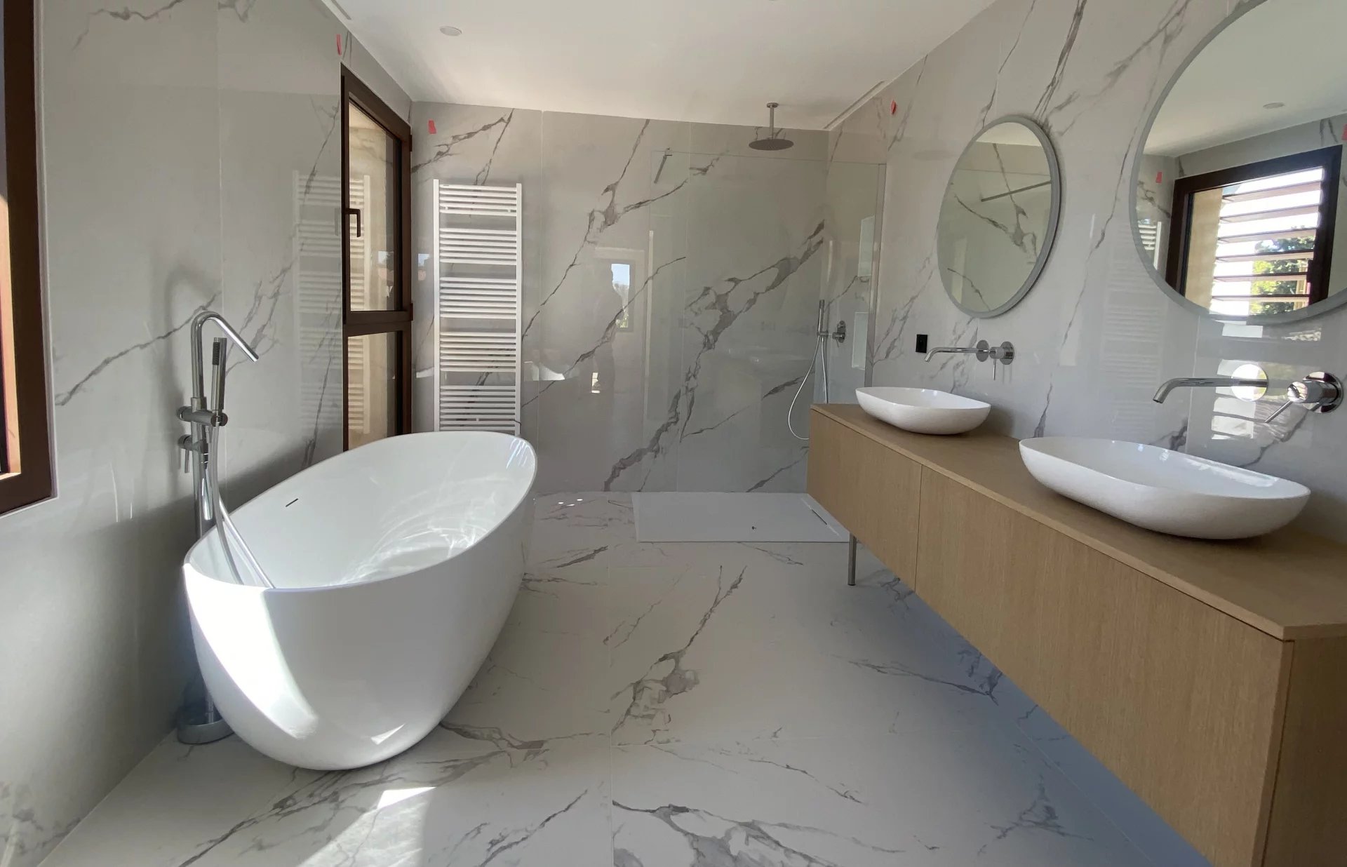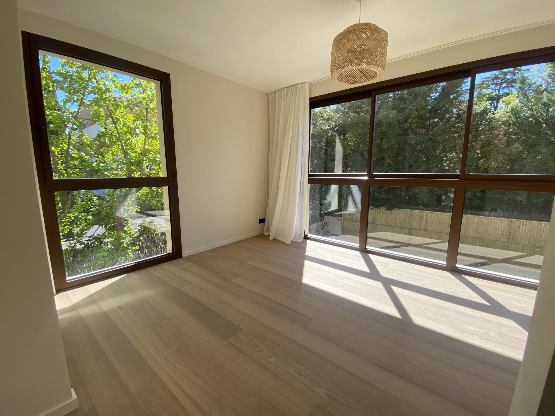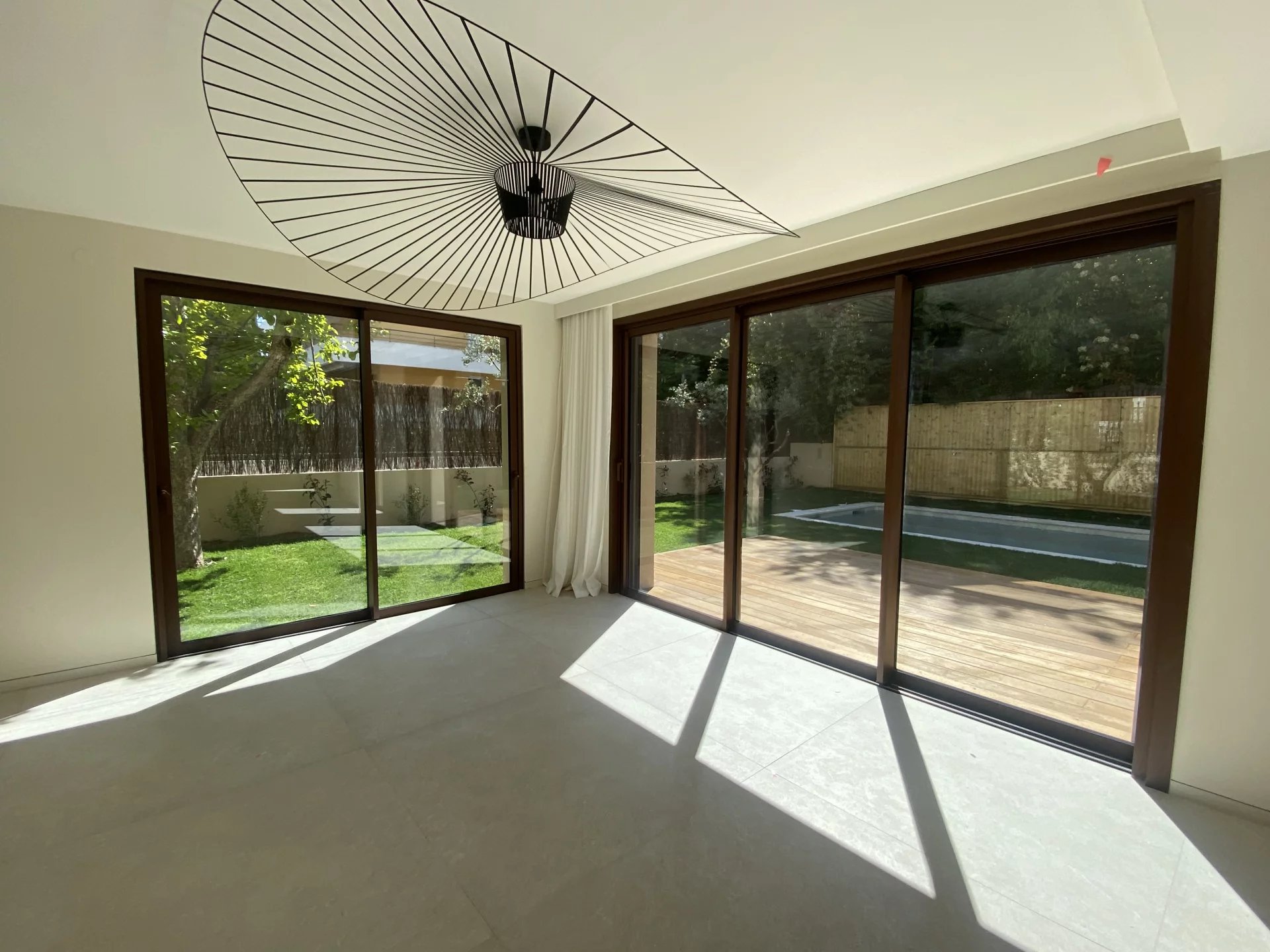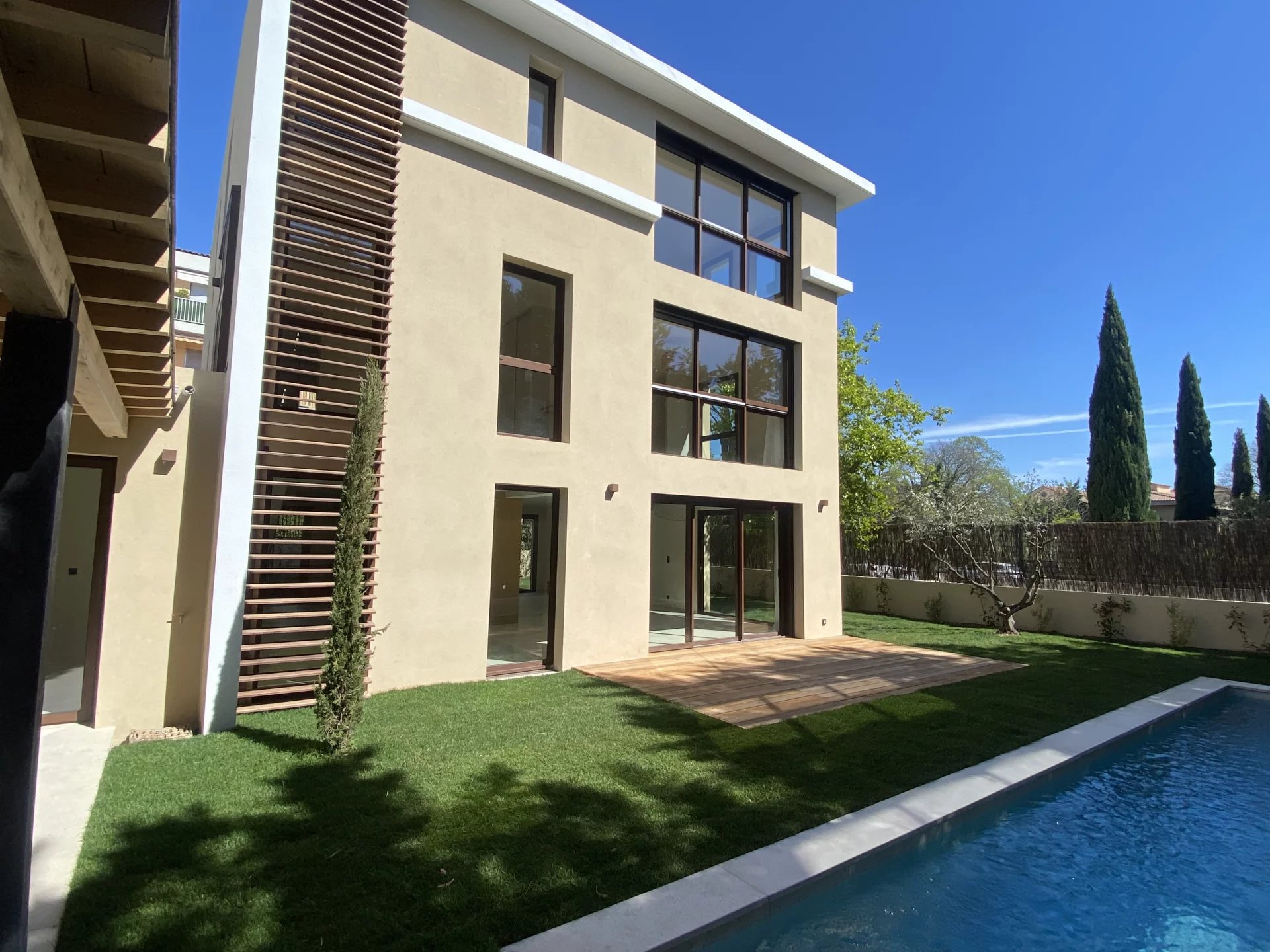Maison de ville neuve meublée, édifiée sur une parcelle de terrain d'environ 450m2, elle est située dans une impasse privée à seulement 150M du centre ville historique et 450M du Cours Mirabeau. Très lumineuse, elle bénéficie d'une triple exposition Est, Sud et Ouest, est élevée de deux étages sur rez-de chaussée, équipée d'un ascenseur et développe environ 230m2 de surface habitable, plus garage attenant et pool-house. Elle se compose en RDC d'une entrée, d'une grande pièce à vivre traversante avec coin feu, salle à manger, cuisine équipée, accès garage. Au 1er étage de 3 chambres avec salle de bains et salle d'eau, une buanderie. Au 2ème étage de deux suites parentales. Grand confort thermique grâce au chauffage par pompe à chaleur réversible. Baies à galandage en aluminium finition brossée. Espace détente autour de la piscine et du pool-house équipé, jardin engazonné avec arrosage automatique, oliviers et jasmins. L'environnement de cette maison est exceptionnel, il permet de profiter du centre-ville historique à pied et bénéficie d'accès pratique vers les axes de circulation, sans subir de nuisances sonores. Proximité des écoles, lycées, infrastructures sportives et du parc de la Torse. Bien d'une grande rareté.