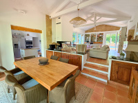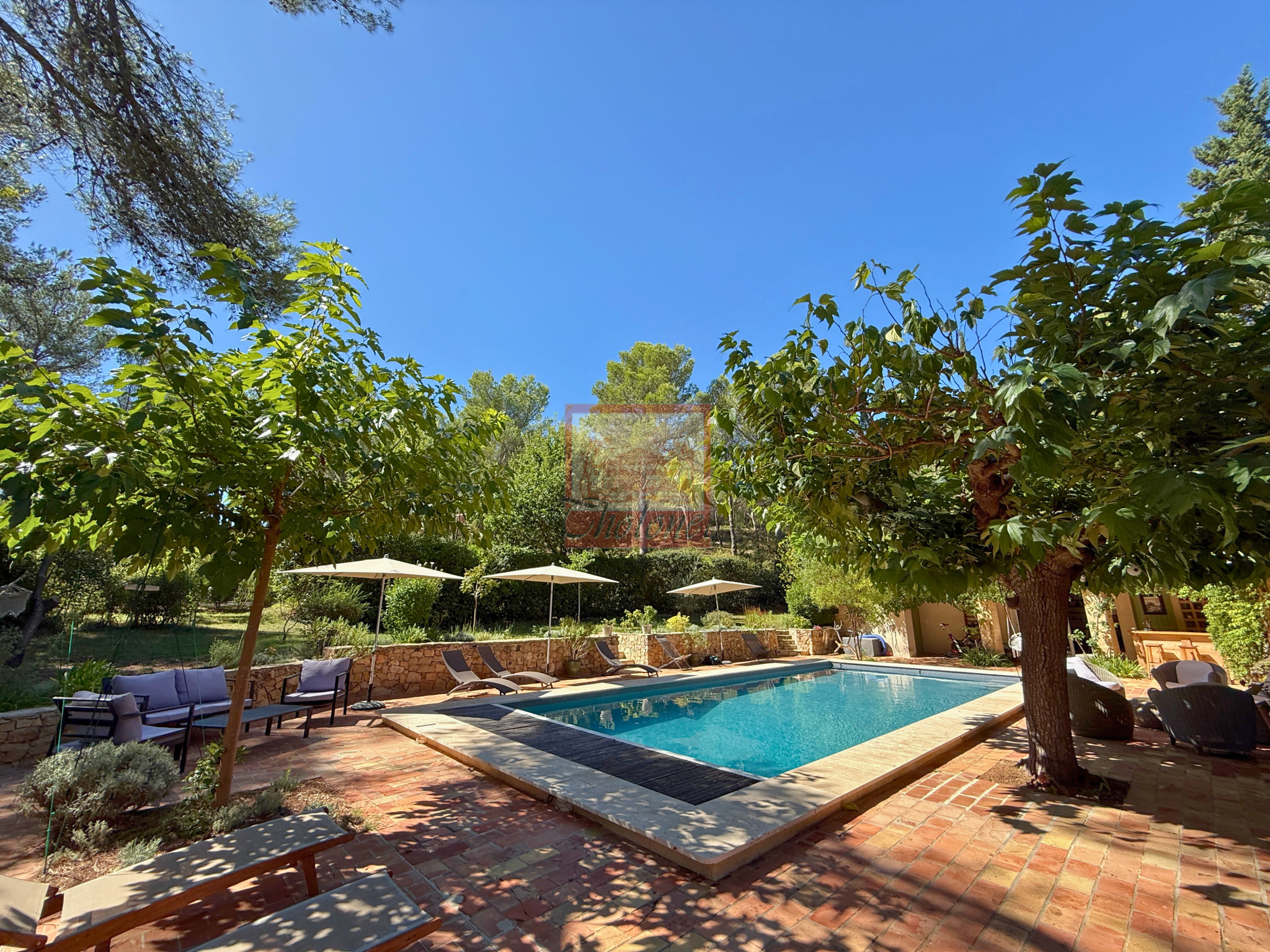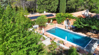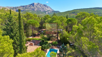 Exclusivité. Véritable coup de coeur pour cette propriété alliant l'élégance de la campagne à proximité de la ville. située à 10 minutes à l'est d'Aix-en-Provence, cette maison d'architecte s'intègre harmonieusement sur un vaste terrain clos de 5249m2. Dès l'entrée, vous serez séduit par les volumes généreux et la hauteur sous plafond du vaste séjour salle à manger qui s'ouvre sur une véranda, un lieu idéal pour la convivialité. La maison dispose d'une cuisine entièrement équipée et d'un cellier. Côté nuit, vous découvrirez une suite parentale avec cheminée, 3 chambres dont 2 avec salle d'eau offrant un confort absolu pour toute la famille. Le vaste jardin vous invite à la détente avec ses terrasses et son espace piscine. Le terrain abrite également deux annexes indépendantes, un appartement T3 de 47m2 et un studio de 25m2. Parfaites pour loger amis et famille ou pour un potentiel revenu locatif. Une opportunité rare dans un cadre idyllique, au calme absolu. Pour plus d'informations, contactez Sophie de Poncins (EI) 06.21.09.45.38 et/ou 04.42.66.80.43. Les informations sur les risques auxques ce bien est exposé sont disponibles sur le site Géorisques : www.géorisques.gouv.fr